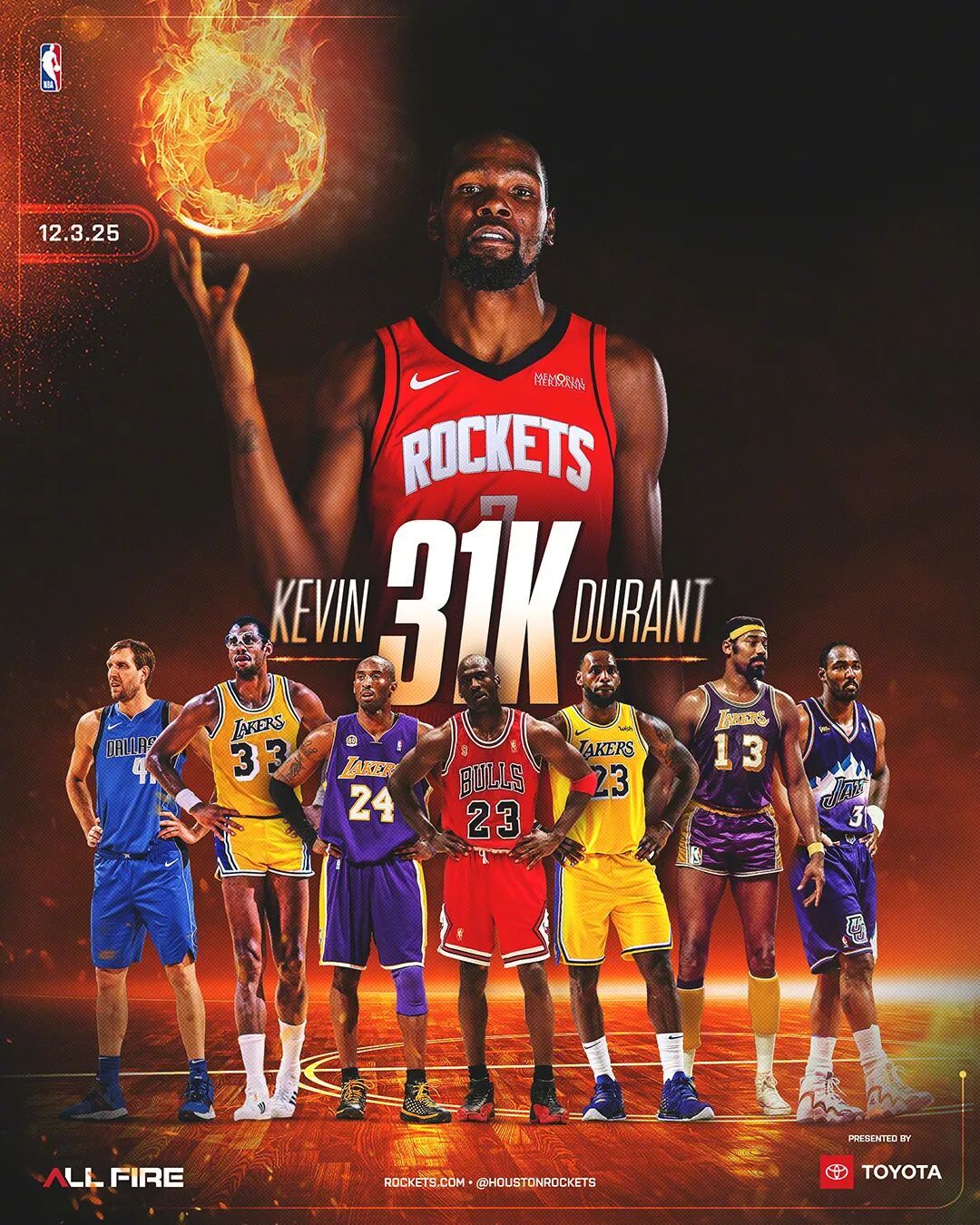 北京技艺12月6日,NBA旧例赛,火箭主场117比98逆转慑服太阳。杜兰特此役活命得分结巴31000分大关,成为NBA历史上第8位得分破31000的球员。